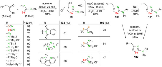 - Koketsu, M.; Kogami, M.; Ando, H.; Ishihara, H. Preparation of 5-acyl-2-amino-1,3-selenazoles by the reaction of selenazadienes with α-haloketone. Synthesis 2006, 2006, 31–36. [Google Scholar] [CrossRef]