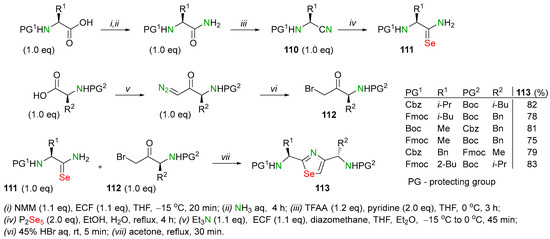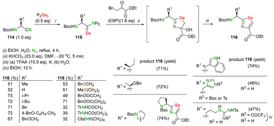 - Madhu, C.; Panguluri, N.R.; Narendra, N.; Panduranga, V.; Sureshbabu, V.V. One-pot synthesis of orthogonally protected dipeptide selenazoles employing N a -amino selenocarboxamides and a -bromomethyl ketones. Tetrahedron Lett. 2014, 55, 6831–6835. [Google Scholar] [CrossRef][Green Version]