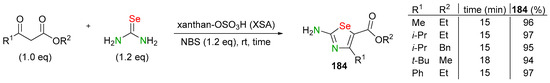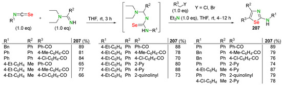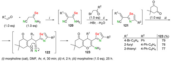- Liu, H.-W.; Fang, Y.; Wang, S.-Y.; Ji, S.-J. Base-promoted multicomponent reactions: A synthesis of 2-amino-1,3-selenazole derivatives. J. Org. Chem. 2020, 85, 3508–3516. [Google Scholar] [CrossRef] [PubMed]
