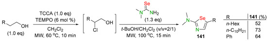 - Macias-Benitez, P.; Sierra-Padilla, A.; Guerra, F.M.; Moreno-Dorado, F.J. Microwave-assisted one-pot telescoped synthesis of 2-amino-1,3-thiazoles, selenazoles, imidazo[1,2-a]pyridines, and other heterocycles from alcohols. J. Org. Chem. 2024, 89, 4628–4646. [Google Scholar] [CrossRef]