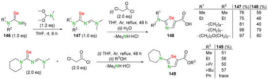 - Koketsu, M.; Mio, T.; Ishihara, H. Facile preparation of 1,3-selenazole-5-carboxylic acids and the carboxylates by reaction of selenazadienes with chloroacetyl chloride preparation of 1,3-selenazole-5-carboxylates. Synthesis 2004, 2004, 233–236. [Google Scholar] [CrossRef]