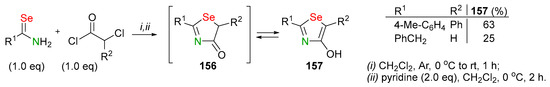 - Koketsu, M.; Takenaka, Y.; Ishihara, H. Preparation of 1,3-selenazol-4-one derivatives from primary selenoamides and haloacyl halides. Synthesis 2001, 2001, 731–734. [Google Scholar] [CrossRef]