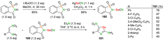 - Yang, H.; Chen, Y.; Xu, X.; Li, Z. Metal-free synthesis of thiocyanated aminonitroalkenes and 2-aminothiazoles/selenazoles from β-aminonitroalkenes and N-thio/selenocyanatosaccharin. Synlett 2023, 34, 176–182. [Google Scholar] [CrossRef]