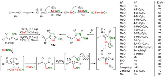 - Tao, S.; Xu, L.; Yang, K.; Zhang, J.; Du, Y. Construction of the 2-amino-1,3-selenazole skeleton via PhICl2/KSeCN-mediated selenocyanation/cyclization. Org. Lett. 2022, 24, 4187–4191. [Google Scholar] [CrossRef]