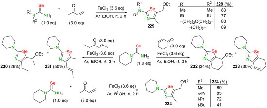 - Koketsu, M.; Kanoh, K.; Ishihara, H. Preparation of 2-amino-1,3-selenazoles by reaction of N,N-unsubstituted selenoureas with α,β-unsaturated ketones in alcohol. Heterocycles 2006, 68, 2145–2152. [Google Scholar] [CrossRef]