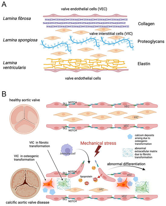 Schematic representation of the pathogenesis of aortic valve calcification in cases where osteoblastic differentiation is involved. (A) Simplified structure of a healthy valve. The aortic valve leaflets contain valvular endothelial cells (VECs), valvular interstitial cells (VICs), and the valvular extracellular matrix, where (i) collagen fibrils/fibers (represented by three collagen triple helices in purple) are prominent in the lamina fibrosa, (ii) proteoglycans (in blue) are abundant in the lamina spongiosa, and (iii) elastin fibers (yellow network) are present in the lamina ventricularis. VECs cover the leaflets and regulate valve permeability and homeostasis. VICs are distributed throughout the entire interstitium regulating valve remodeling via synthesis and degradation of valvular extracellular matrix components. Few resident macrophages and dendritic cells as well as a small number of myofibroblast-like VICs, although also present [13] are not depicted here. (B) Further simplified representation of cellular events leading to calcific aortic valve disease (CAVD), where the three-valve laminae are not displayed. Notch signaling is essential for maintaining endothelial barrier integrity and proper function (upper figure). Mechanical stress compromises the integrity of the endothelial layer contributing to CAVD development (lower figure): disruption of the barrier function leads to lipoproteins entering the interstitium of the valve leaflets and their oxidation by reactive oxygen species. This process is associated with (i) fibrogenic and/or osteogenic response of VICs, (ii) abnormal differentiation of VECs, and (iii) immune cell infiltration into the leaflet, triggering inflammation and further enhancing the alteration of extracellular matrix composition, ultimately leading to valve dysfunction.