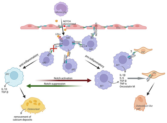 Juxtacrine Notch signaling may play a role at different stages of macrophage involvement in CAVD development. In CAVD, monocytes infiltrate valve tissues due to reduced integrity of VECs and then turn into naive macrophages M0. The reduction in VECs integrity occurs due to mechanical stress and loss of cell–cell Notch contacts after Notch receptor glycosylation observed in inflammatory conditions. In addition to monocytes and other immune cells, low-density lipoproteins (LDLs) also infiltrate the valve and act as osteogenic provocateurs in various ways. LDLs can activate TLRs in macrophages, which in turn induce the expression of Notch receptors and ligands, including Jagged1, Dll1, and Dll4. Activation of the Notch pathway in macrophages can lead to their differentiation into pro-inflammatory M1 phenotype and impact CAVD progression. Furthermore, VECs can induce macrophage M1 transition by losing the Notch4 receptor (while Notch1-3 remain expressed) and increasing the production of Dll4 by both VECs and immune cells. M1 macrophages express cytokines that promote inflammation and influence the osteogenic differentiation of resident valve cells. These cytokines can regulate the Notch signaling pathway by increasing the expression of NOTCH1, potentially in VICs as well. Dysregulation of Notch signaling, in turn, stimulates VICs to differentiate into myofibroblast-like cells or osteoblast-like cells. However, it is still unclear whether direct contact between macrophages and VICs via Notch receptors and ligands occurs in CAVD.