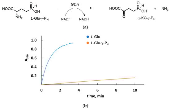 The substrate properties of L-Glu-γ-PH (Figure 1b) on bovine liver GDH were initially investigated in Tris–HCl buffer at pH 7.5 at 25 °C (according to the instructions of the manufacturer details in Section 2.1) and compared with that of L-glutamate. Under these experimental conditions, the physiological substrate, L-glutamate, is rapidly (i.e., within 2 min) oxidized, and NADH is formed, as can be directly recorded by monitoring the increase in absorbance at 340 nm (the NADH absorbance maximum). Under the same experimental conditions, L-Glu-γ-PH (10 mM) is oxidized at a much slower rate (Figure 2). It is worth remarking that 10 mM L-Glu-γ-PH may be lower than the Km value if taking, as reference, the known Km value of L-Glu-γ-PH in a PLP-dependent glutamate decarboxylase reaction and the Km values of the α-amino-H-phosphinic analogues of methionine and tyrosine in methionine-γ-lyase and tyrosine phenol-lyase reactions ([17] and ref. within). Nevertheless, the substrate properties of L-Glu-γ-PH on GDH can be determined a priori without exposing the enzyme to a disproportionally high L-Glu-γ-PH concentration for the qualitative purpose of this preliminary investigation.
