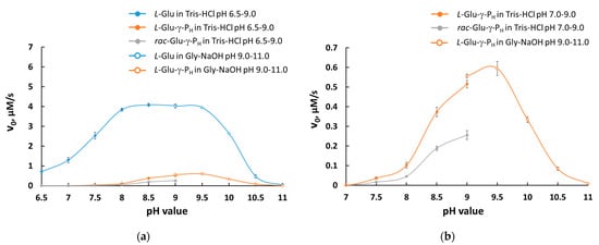 To investigate in more detail the substrate properties of L-Glu-γ-PH, the pH dependence of the GDH reaction was studied in the pH range of 6.5–11.0. The reaction turned out to be faster in the pH range of 8–9 compared with the reaction rate at pH 7.5 (Figure 3). This turned out to be true for all tested compounds, i.e., L-glutamate, L-Glu-γ-PH and rac-Glu-γ-PH. Again, in these experiments, both L-glutamate and L-Glu-γ-PH were used at 10 mM, respectively.