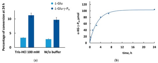 With the aim of setting up a preparative enzymatic synthesis of α-KG-γ-PH, the reaction was performed in a buffer-free system at pH 9.0. Under these conditions, the pH dropped to 8.7 after 24 h, and the percentage of conversion of L-Glu-γ-PH into α-KG-γ-PH was about 9%, i.e., slightly decreased compared to the same reaction carried out in Tris–HCl buffer (Figure 4a).