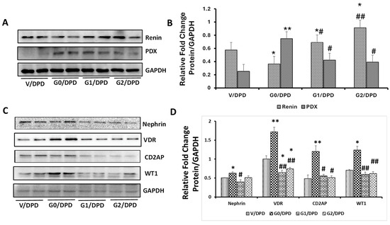 Cellular lysates from differentiated podocytes (DPDs) expressing vector (V/DPD), APOL1G0 (G0/DPD), APOL1G1 (G1/DPD), and APOLG2 (G2/DPDs) were probed for renin, Podocalyxin (PDX), and GAPDH. Representative gels are displayed in Figure 1A. Cumulative densitometric data are shown in Figure 1B. A significantly lower level (p < 0.05) of renin was observed in podocytes expressing G0/DPDs when compared with V/DPDs; in contrast, G1/DPDs (p < 0.05) and G2/DPDs (p < 0.01) exhibited a higher expression of renin when compared to V/DPDs. However, the expression of PDX was significantly increased in G0/DPDs when compared to V/DPDs (p < 0.01), G1/DPDs (p < 0.05), and G2/DPDs (p < 0.05).