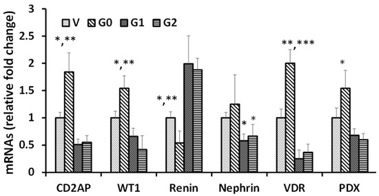 Podocyte mRNA level alterations in APOL1 milieus. To determine mRNA levels of APOL1-expressing podocytes, RNAs were extracted from cellular lysates V/DPDs, G0/DPDs, G1/DPDs, and G2/DPDs (n = 4). cDNAs were amplified using specific primers (CD2AP, WT1, renin, VDR, and PDX [podocalyxin]). CD2AP: * p < 0.05 with respective V and ** p < 0.01 with respective G1 and G2; WT1: * p < 0.05 with respective V and ** p < 0.01 with respective G1 and G2; Renin: * p < 0.05 with respective G0 and ** p < 0.01 with respective G1 and G2; Nephrin: * p < 0.05 with respective V and G0; VDR: ** p < 0.01 with respective V and *** p < 0.001 with respective G1 and G2; PDX: * p < 0.05 with respective V, G1, and G2.