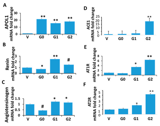 Renin-angiotensin status in APOL1 milieus. RNAs were extracted from V/DPD, G0/DPD, G1/DPD, and G2/DPD (n = 4), and cDNAs were amplified with specific primers for APOL1, renin, angiotensinogen, ACE1, AT1R, and AT2R. (A) APOL1: ** p < 0.01 compared to V. (B) Renin: * p < 0.05 compared to V; ** p < 0.01 compared to V and G0; # p < 0.05 compared to V and G1. (C) # p < 0.05 compared to V, G1, and G2; * p < 0.05 compared to V. (D) ** p < 0.01 compared to V, G0, and G1. (E) AT1R: * p < 0.05 compared to V, G0, and G2; ** p < 0.01 compared to V and G0. (F) AT2R: * p < 0.05 compared to V and G0; ** p < 0.01 compared to V, G0, and G1.