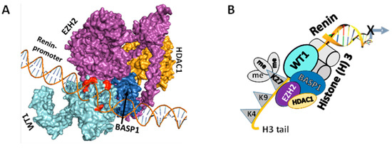 The structural construct of the WT1-BASP1 repressor complex. (A) Homology modeling and docking studies suggested the binding of WT1-BASP1 repressor complex on the renin promoter. (B) A schematic diagram displays the formation of the WT1-BASP1 repressor complex at the renin promoter. WT1 recruits BASP1, EZH2, and HDAC1, inducing methylation at Lysine 27 residues at Histone (H) 3 tail.