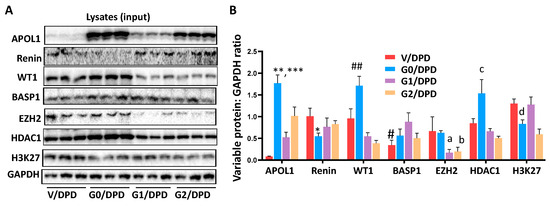 Analysis of input lysates of podocytes expressing APOL1 non-risk and risk alleles. (A) Proteins were extracted from the cellular lysates of V/DPDs, G0/DPs, G1/DPDs, and G2/CDPs (n = 3–4). Gels from three independent lysates are displayed. (B) Cumulative densitometric data of proteins displayed in 3A are shown in a bar diagram. APOL1: ** p < 0.01 vs. G1/DPD and G2/DPD; *** p < 0.001 vs. V/DPD; Renin: * p < 0.05 vs. respective variables; WT1: ## p < 0.01 vs. respective variables; BASP1: # p < 0.05 vs. respective variables; EZH2: a p < 0.01 vs. V/DPD and G0/DPD; b p < 0.01 vs. V/DPD and G0/DPD; HDAC1: c p < 0.01 vs. respective other variables; H3K27me3: d p < 0.01 vs. V/DPD, G1/DPD, and G2/DPD.