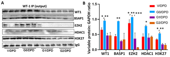 To validate the components of WT1-BASP1 repressor complexes, the lysates mentioned above were immunoprecipitated with the WT1 antibodies (n = 3). Protein blots of WT1-IP fractions (output) were probed for WT1, BASP1, EZH2, HDAC1, H3K27me3, and IgG. Gels are displayed in Figure 7A. Cumulative densitometric data are shown in bar graphs (Figure 7B). IP fractions showed enhanced expressions of WT1, BASP1, EZH2, HDAC1, and H3K27me3 in G0/DPDs.