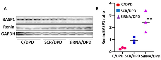 Effect of BASP1 silencing on the podocyte expression of renin. (A) Cellular lysates of control podocytes (C/DPD), scrambled siRNA- (SCR/DPD), and BASP1-SiRNA-transfected podocytes (SiRNA/DPD) were probed for renin and GAPDH (n = 3). Gels of three independent lysates are shown. (B) Cumulative densitometric data (n = 3) are shown in bar graphs. ** p < 0.01 vs. C/DPD and SCR/DPD.
