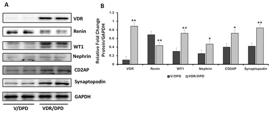 Vitamin D, as well as VDR agonist, have been demonstrated to attenuate the expression of renin in podocytes [26,27]. We asked whether overexpression of VDR in podocytes would downregulate the expression of renin in podocytes; if so, the reduction in renin would be associated with enhanced expression of the podocyte molecular markers. To generate overexpression of VDR, podocytes were treated with either vehicle (V) or a VDR agonist, and the cellular lysates were probed for VDR and renin and reprobed for molecular markers. Representative gels are displayed in Figure 9A. Cumulative densitometer data are provided in a bar diagram (Figure 9B). Podocytes overexpressing VDR (VDR/DPDs) showed an enhanced expression (p < 0.01) of VDR, but decreased expression (p < 0.01) of renin when compared to V/DPD. Moreover, VDR/DPDs exhibited increased expression of podocyte molecular markers in comparison to V/DPDs.