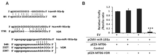 A LUC-pair duo-luciferase assay was performed to validate the binding of miR193a-5p to VDR 3′ UTR. The presented results are cumulative values of three independent experiments, each conducted in triplicate (Figure 11B). The luciferase assay validated miR193a binding sites on VDR.
