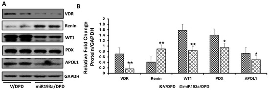We have previously demonstrated that enhanced miR193a expression in podocytes was associated with attenuated VDR mRNA expression, and inhibition of miR193a enhanced VDR mRNA expression in podocytes [15]. Now, we have validated miR193a binding at 3′ UTR of the VDR gene. Because VDR negatively modulates renin expression [26,27], its reduction will activate the RAS and compromise podocyte health. To confirm this notion, podocytes overexpressing miR193a were probed for renin and podocyte molecular markers. Three sets of DPDs were transfected with miR193a; proteins were extracted and probed for VDR and reprobed for Renin, WT1, PDX, and APOL1. Blots were reprobed for GAPDH. Representative gels are displayed in Figure 12A. Cumulative densitometric data are shown in Figure 12B. miR193a/DPDs showed a significant decrease (p < 0.01) in VDR and an increase in renin expression when compared to V/DPDs (Figure 12B). miR193a/DPS showed a decrease (p < 0.05) not only in APOL1, but also in PDX and WT1 expression when compared to V/DPDs (Figure 12A,B).