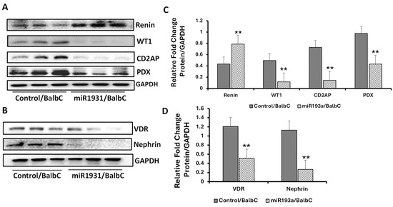 Patients with idiopathic FSGS have been shown to display enhanced glomerular expression of miR193a [17]. miR193aTr mice are also an experimental animal model of idiopathic FSGS [17]. Based on our cellular data, we hypothesized that renal tissues of miR193aTr mice would display reduced VDR but increased expression of renin. To validate this hypothesis, proteins were extracted from the renal tissues of control (Balb/C, n = 3) and experimental (miR193aTr, n = 3) mice and probed for renin, WT1, CD2AP, PDX, and GAPDH. Representative gels from three different lysates are shown in Figure 13A.