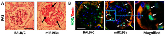 We carried out PAS staining on renal cortical sections of BALB/C and miR193aTr mice to confirm the development of glomerulosclerosis. A representative glomerulus from a control (BALB/C) and an miR193aTr mouse are displayed in Figure 14A. Capillary loops in the glomeruli from an miR193aTr mouse displayed overt sclerosis. To examine the expression of VDR and renin in the kidney, renal cortical sections were immunolabeled for VDR and renin. Nuclei were stained with DAPI. Representative glomeruli from control and miR193aTr mice are shown in Figure 14B. Podocytes in the glomerulus from a BALB/C mouse predominantly showed VDR expression and hardly any expression of renin; in contrast, podocytes in the glomerulus from an miR193aTr mouse displayed labeling for both VDR and renin (green and red fluorescence).