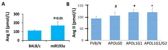 Ang II levels were determined in plasma samples of control (BALB/C, n = 6 and FVBN, n = 9) and experimental (miR193aTR, n = 6; APOL1 G0, n = 10; APOL1 G1, n = 9; and APOL1G1/G2, n = 9) mice. Results (means ± SD) are shown in bar diagrams. (A) Plasma Ang II levels in control (BALB/C) and miR193aTr mice. (B) Plasma Ang II levels in control and APOL1 mice. * p < 0.05 vs. FVBN; # p < 0.05 vs. APOL1G1.