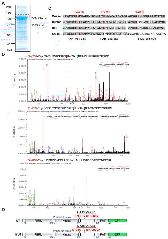 Identification of O-GlcNAcylation sites on FAK through LC-MS/MS. (A) VSV-G-tagged mouse FAK was transfected into 293T cells, and cell lysates were subjected to immunoprecipitation and separated using 7.5% SDS-PAGE gel. The FAK-VSV-G band (red dashed line) was cut off for LC-MS analysis. (B) The sites for determining FAK O-GlcNAcylation were mapped using MS to detect O-GlcNAcylation sites on FAK. O-GlcNAcylation peptides were analyzed through LC-MS/MS. Analysis with the Byonic software identified O-GlcNAcylation on three peptides, as indicated. The Ser708, Thr739, and Ser886 sites were marked in red. The phosphorylation site at Ser722 was also detected and shown in red. (C) Sequence alignments of FAK at Ser708, Thr739, and Ser886, along with adjacent sequences from different species with conserved serine/threonine residues, were highlighted in red. (D) Schematic representation of the wild-type and mutant plasmids utilized in this study. From the N-terminus to the C-terminus are the FERM domain, the kinase domain, the FAT domain, and the GFP tag, where the three black bars represent three proline-rich regions (PRR1, PRR2, PRR3). The MUT indicates that the Ser or Thr at Ser708, Thr739, and Ser886 sites were replaced with Ala through site-directed mutagenesis.