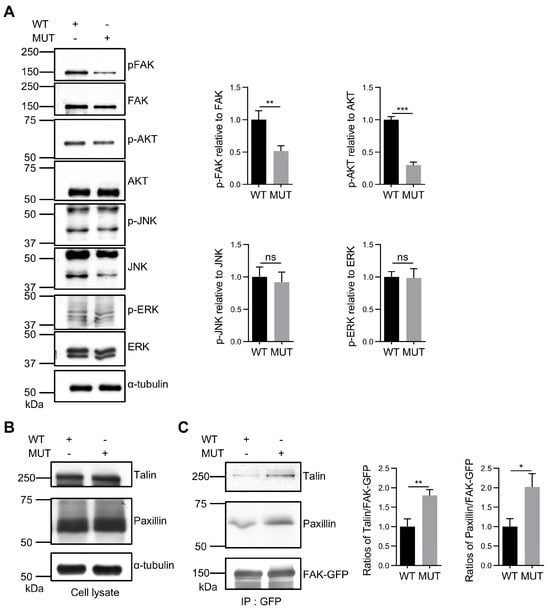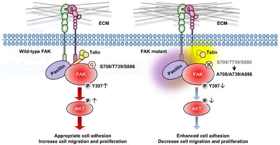 The formation of FAs by FAK with paxillin and talin is essential for the dynamic multiprotein complexes that regulate cell behaviors, such as cell adhesion and cell migration [57,58,59]. To assess the formation of FA complexes on FN-coated substrates, we conducted immunoblotting with anti-paxillin and anti-talin antibodies on FAK immunocomplexes. The total expression levels of paxillin and talin did not differ significantly between the WT and MUT cell lysates (Figure 5B), but their levels in FAK immunoprecipitant were increased in the MUT cells compared to the WT cells (Figure 5C). These findings underscore the roles of O-GlcNAcylation at Ser708, Thr739, and Ser886 on FAK in the formation of FA complexes, which in turn regulates the activation of the FAK/AKT signaling cascade and influences cell migration and proliferation.