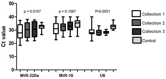 Analysis of the cycling threshold by qRT-PCR of miR-320a, miR-16, and U6 and their respective significance levels (p) in samples from the control group (n: 33) and the study group (n: 58). The evaluation was performed in 33 samples of the control group and in 58 samples of the group of patients with breast cancer, with collection 1 being performed before the neoadjuvant treatment (22 samples), collection 2 when 50% of the neoadjuvant treatment had been performed (21 samples), and collection 3 after the end of the neoadjuvant treatment (15 samples).