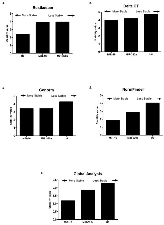 Stability levels of MiR-320a, MiR-16, and U6 evaluated in samples from the control group (n: 33) and the study group with breast cancer (n: 58) by several platforms and by Delta CT: (a) BestKeeper; (b) Delta CT (cycling threshold); (c) Genorm; (d) NormFinder; (e) Global analysis by RefFinder.