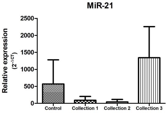 Regarding the expression of miR-21 during neoadjuvant treatment of breast cancer, studies have demonstrated its potential use as a predictor of response to treatment [,], with its expression reduced at the end of therapy [,,]. These findings differ from the results obtained in our study, in which miR-21 expression was higher at the end of neoadjuvant treatment (collection 3), as shown in Figure 4.