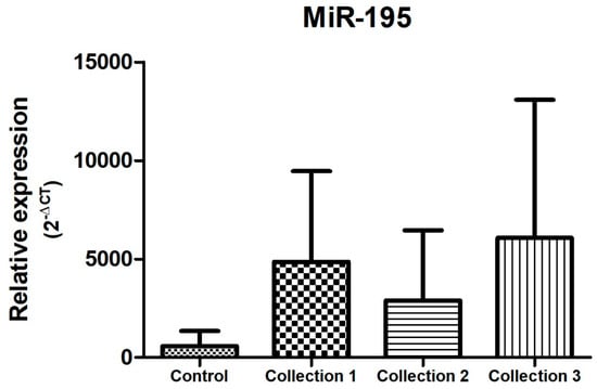 Relative expression of miR-195. Total N: 85 samples; control, n: 29; collection 1 (before neoadjuvant treatment), n: 22; collection 2 (after 50% of the neoadjuvant treatment), n: 20; collection 3 (after the end of neoadjuvant treatment and before surgery), n: 14.