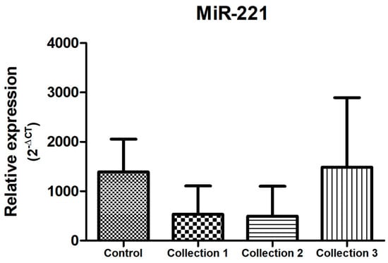 Regarding the behavior of miR-221 during neoadjuvant treatment of breast cancer, in our study, this microRNA showed overexpression at the end of treatment (collection 3) compared to the beginning (collection 1), as shown in Figure 7. Gezer et al., in 2014, demonstrated a higher expression of miR-21, miR-195, and miR-221 in the plasma of participants with breast cancer before neoadjuvant treatment compared to other microRNAs included in the study, with miR-221 showing variation in its expression among participants during neoadjuvant treatment []. Zhao et al., in 2011, demonstrated that the overexpression of miR-221 was associated with the subtype of invasive breast cancer with negative hormone receptor and resistance to the therapy instituted [].