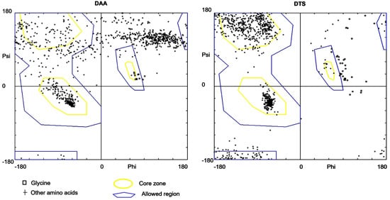 The quality of DAA and DTS modeled structures under the AlphaLarge protocol was compared with their experimentally known structure employing standard structure validation parameters as given in step 6 of Section 2.2.2 to select the best structure model. The comparison of DTS with DAA was performed on the basis of the following two criteria for a specific validation parameter: