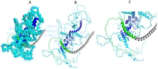 Figure 7. Syn-1 and a-Syn (mutated) complex structure: (A) Surface filling model of the AlphaLarge predicted structure of Syn-1 (cyan overall with deep blue highlighting central coiled coil region) and ribbon representation of mutated a-syn (N-terminal 1–65 in grey ribbon), (B) ribbon representation of the complex and (C) zoomed version of (B) showing interactions with mutated a-syn through C-terminal (green ribbon).