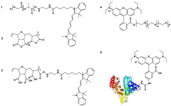 Chemical structures of fluorescently labeled polymers used for the preparation of core–shell nanoparticles: (1) PLGA conjugate with Cyanine5 (PLGA-Cy5), (2) DIVEMA in anhydride form, (3) DIVEMA conjugate with Cyanine3 (DIVEMA-Cy3), (4) poloxamer 188 conjugate with rhodamine B (P188-RhB), and (5) HSA conjugate with rhodamine B (HSA-RhBITC).