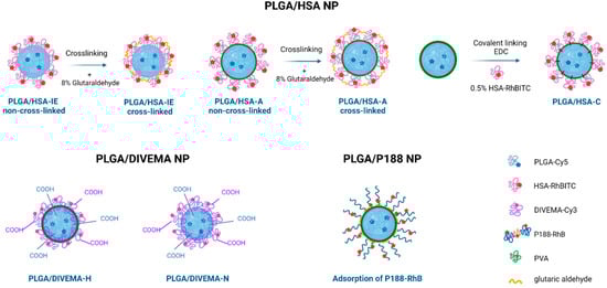 The core PLGA nanoparticles were prepared through the commonly used method of high-pressure homogenization followed by solvent removal. This method involves the emulsification of a PLGA solution in DCM in an aqueous solution of polyvinyl alcohol (PVA), one of the most popular stabilizers used for the preparation of PLGA nanoparticles [31]. The core–shell nanoparticles were prepared using previously established techniques, including the adsorption of the shell-forming polymers onto the previously prepared core PLGA nanoparticles (P188, HSA); interfacial embedding, achieved by adding the shell-forming polymer in the course of nanoparticle preparation (DIVEMA, HSA); or covalent linking of the shell to the PLGA’s carboxyl end groups (HSA) [27,28,29].