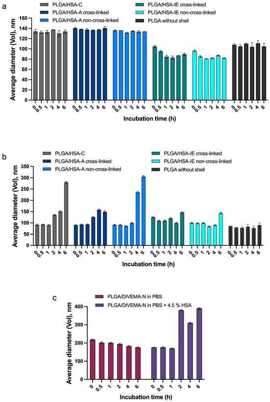 Average diameters of core–shell nanoparticles during 6 h of incubation in model media (pH 7.4; 37 °C; mean ± SD; n = 3): (a) PLGA-Cy5/HSA-RhB incubation in PBS; (b) PLGA-Cy5/HSA-RhB incubation in PBS in the presence of 4.5% HSA; and (c) PLGA-Cy5/DIVEMA-Cy3 incubation in PBS in the presence or absence of 4.5% HSA. PLGA nanoparticles without a shell were used as a control. Size measurements were performed using DLS (volume distribution).