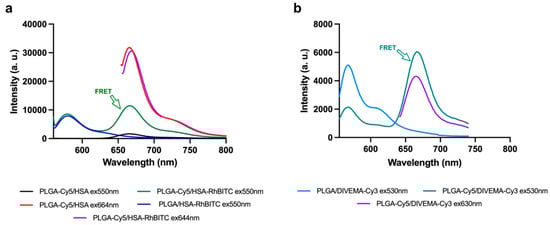 In the present study, FRET was detected for the Cy5—Cy3 (PLGA-Cy5/DIVEMA-Cy3 NP) and Cy5—RhBITC (PLGA-Cy5/HSA-RhBITC) pairs. As shown in Figure 5 (representative images), the fluorescence intensity of the acceptor in the double-labeled nanoparticles is detected when the excitation occurs at the donor’s wavelength (550 nm for RhBITC and 530 nm for Cy3). Normalized spectra of potential FRET pairs using Cy5 as the acceptor are shown in Supplementary Figure S7.
