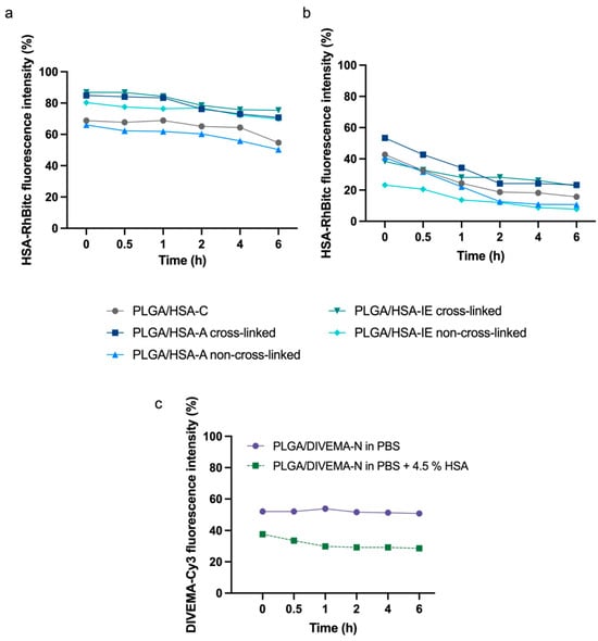 Adsorption of HSA: To prepare PLGA/HSA nanoparticles through adsorption, PLGA-Cy5 nanoparticles were first prepared using 1% polyvinyl alcohol (PVA, 9–10 kDa, 80% hydrolyzed, Merck, Darmstadt, Germany) as a stabilizer, as described in [38]. Then, the nanoparticles were washed with water and resuspended in a 0.5% aqueous HSA-RhBITC solution, followed by 30 min of incubation under continuous stirring (37 °C, 130 rpm). Unbound HSA-RhBITC was removed through repeated centrifugation (48,060× g, 18 °C, 10 min). The supernatants were successively analyzed using spectrophotometry for the presence of unbound HSA. A portion of the sample was subjected to HSA cross-linking [28], followed by freeze-drying, as described above.