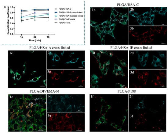 To assess the core–shell structure integrity of the nanoparticles as well as their colocalization with lysosomes (for the evaluation of their major NP internalization pathway and intracellular localization), the Manders’ overlap coefficient (MOC) values were calculated. The MOC values were calculated within the selected ROIs—with three random ROIs per image. Colocalization plots were built to compare the core–shell integrity of the nanoparticles (HSA, DIVEMA, or P188 shells with PLGA cores) obtained using different techniques.