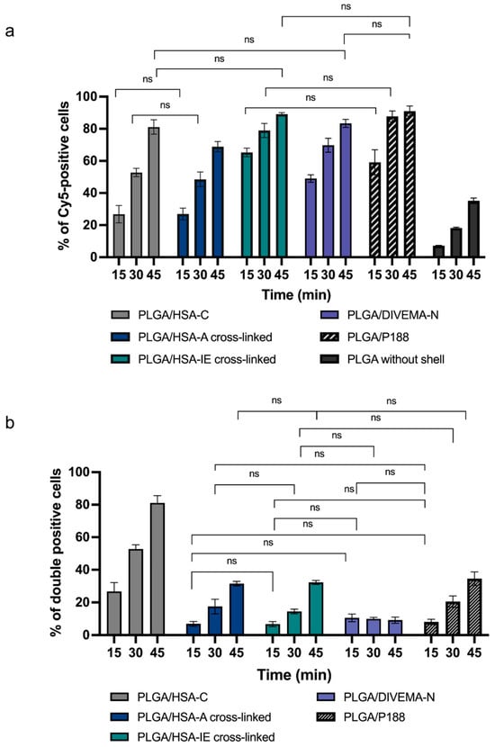 At the specified time points, the cells were washed twice with HBSS buffer, detached using TrypLE solution (ThermoFisher, Waltham, MA, USA), and centrifuged at 1000× g (5 min, 18 °C). The cell pellets were resuspended in FACS buffer and analyzed on the FACS MoFlo XDP (Beckman Coulter, Brea, CA, USA). The nanoparticle uptake by the cells was determined as the percentage of NP-positive cells: PLGA-Cy5-positive or double-positive (PLGA-Cy5- and HSA-RhBITC//DIVEMA-Cy3/RhB-positive cells).