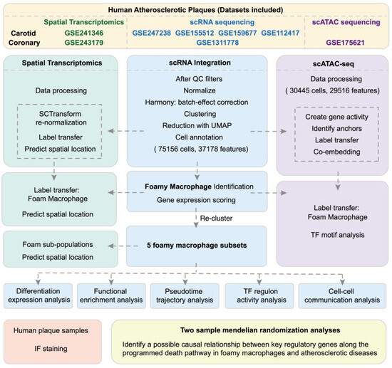 The following supporting information can be downloaded at https://www.mdpi.com/article/10.3390/biom14121606/s1: Figure S1: Public datasets used to build the integrated single-cell analysis for human atherosclerosis; Figure S2: Integration of single-cell RNA sequencing datasets; Figure S3: Integration of single-cell RNA-sequencing, spatial transcriptomic and chromatin accessibility sequencing datasets; Figure S4: The genes used to calculate Foam_Score and their reported function; Figure S5: Characterization of foamy and non-foamy macrophages in human atherosclerotic plaques; Figure S6: Characterization of distinct foamy macrophage subsets in integrated scRNA-seq data; Figure S7: Characterization of foamy macrophage subsets in integrated scATAC-seq data; Table S1: Information of datasets used in the study; Table S2: Detailed information of MR analyses; Table S3: Strobe MR checklist.