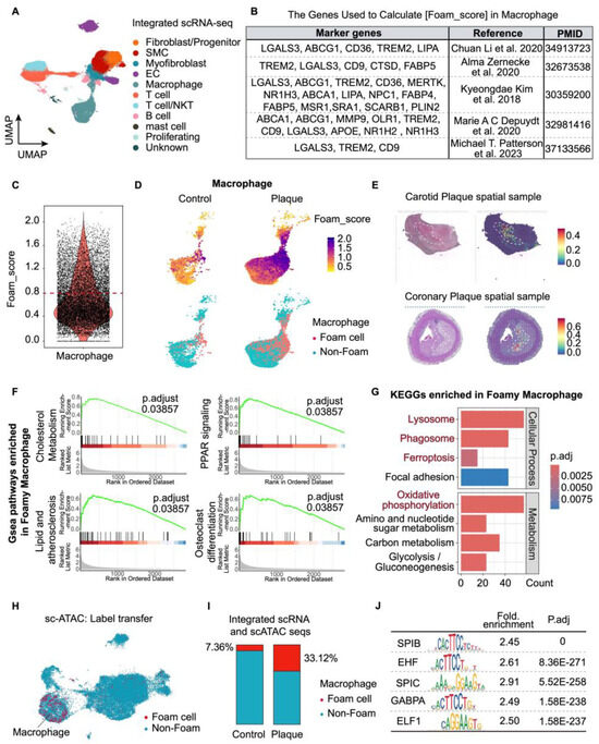 Identification and characterization of foam macrophages in human atherosclerotic plaques. (A) UMAP representation of integrated scRNA-seq data (75,156 cells) from human atherosclerotic plaques with identification of the major cell lineages. (B) Marker genes of foam cells reported in previous studies [5,8,14,15,16]. (C) Violin plot showing the distribution of Foam_score in scRNA-seq data. (D) UMAP embeddings of Foam_score and ‘Foam cell’ cluster. The Foam_score was calculated for each cell based on the expression of foam marker genes listed in (B). ‘Foam’ cluster was identified based on the Foam_score. (E) Predicted spatial location of identified foam cells in the sections of human carotid and coronary atherosclerotic plaque samples. (F) Top GSEA pathways associated with ‘Foam’ macrophages. (G) Top KEGG pathways associated with ‘Foam’ macrophages. (H) Projection of scRNA-seq ‘Foam cell’ and ‘Non-Foam’ labels over the scATAC-seq clusters (30,445 cells). (I) Bar plot showing the distribution of ‘Foam cell’ and ‘Non-Foam’ clusters across control and plaque groups in the integrated data. (J) Top differential open chromatin TF motifs by chromVAR in ‘Foam’ cluster. P. adj, adjusted p-value by Benjamini–Hochberg procedure.