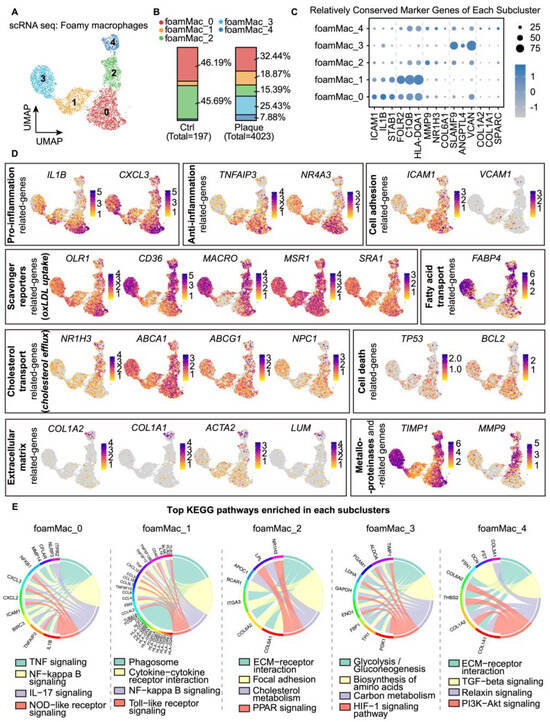 Subclustering of foamy macrophages revealed 5 distinct subsets. (A) UMAP embedding of 5 foamy macrophage subsets (4220 cells). (B) Bar plot showing the distribution of foamy macrophage subsets across control and plaque groups. (C) Dot plot showing expression of top marker genes in foamy macrophage subsets. (D) UMAP embeddings of canonical marker genes related to different functions. Normalized gene expression is indicated by color. (E) Top KEGG pathways associated with each subset of foamy macrophages.