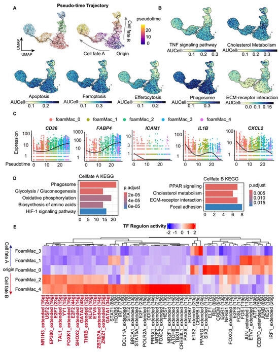 Pseudotime and TF regulon activity analyses for the foamy macrophage subsets. (A) UMAP embeddings showing the pseudotime trajectory calculated with Monocle3 (4220 cells). The numbered circle depicts the trajectory root defined as the pro-foam subset. (B) UMAP embeddings showing the activity of each pathway calculated by AUCell in the foamy macrophage subsets. (C) Expression levels of genes along pseudotime. (D) Top KEGG pathways associated with pseudotime cell fate A or cell fate B. (E) TF regulon activity prediction of foamy macrophage subsets. p. adj, adjusted p-value by Benjamini–Hochberg procedure.