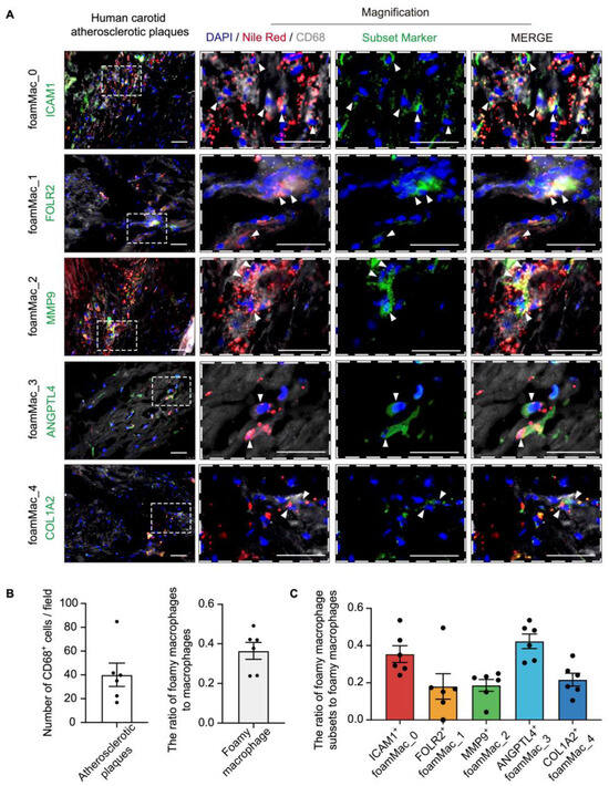 Immunostaining of the foamy macrophage subsets in human atherosclerosis. (A) Immunostaining for Nile Red, CD68, foamy macrophage subset markers (ICAM1, FOLR2, MMP9, ANGPTL4, and COL1A2) and DAPI on human carotid atherosclerotic plaques sections. Arrows indicate Nile Red+ CD68+ subset marker+ cells. (B,C) Quantification of foamy macrophages in macrophages (B) and each foamy macrophage subset in foamy macrophages (C). Data are mean ± SEM; n = 6, biological replicates. Scale bars: 50 μm.