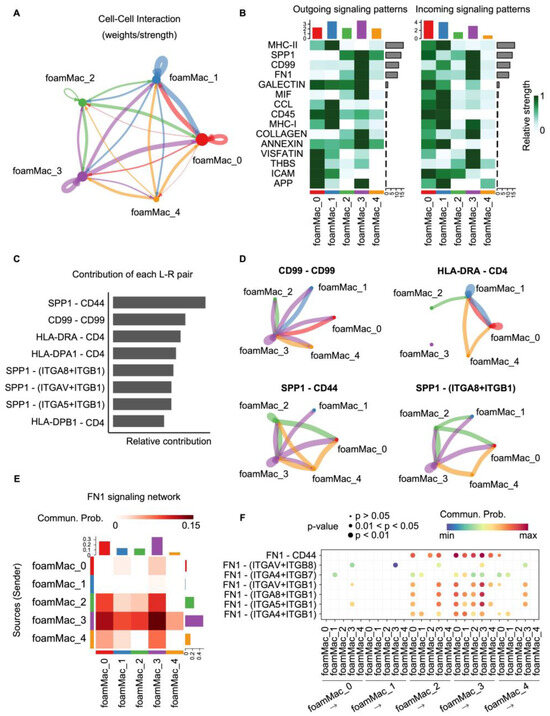 Subsequently, we identified several potentially prominent signaling axes, including FoamMac_3 sending Osteopontin (SPP1), FoamMac_1 sending MHC-II, FoamMac_3 sending fibronectin 1 (FN1) and FoamMac_3 sending CD99 (Figure 6B). Ligand–receptor contribution was further calculated (Figure 6C). SPP1/CD44 interactions, known to play an immunosuppressive role [34], were primarily from more developed foamy macrophage subpopulations (e.g., FoamMac_3 and FoamMac_4) (Figure 6D). CD44, besides facilitating immune evasion, also promoted foam cell adhesion and macrophage recruitment to lesions, underscoring its significance in atherosclerotic progression [35]. We also observed potential interactions from SPP1 on relatively mature foamy macrophage subpopulations (e.g., FoamMac_3 and FoamMac_4) to integrin α8β1 (ITGA8+ITGB1) on most foamy subpopulations (Figure 6D). CD99-CD99 interactions were possibly mainly from FoamMac_3 and targeted every foamy macrophage population (Figure 6D). This interaction is potentially associated with cell migration and adhesion, especially transendothelial leukocyte migration [35]. Moreover, HLA-DRA-CD4 were predicted to interact between foamy macrophage subpopulations except FoamMac_3, leading to mutual activation and facilitating the antigen presentation process [36]. For the FN1 signal, which mainly included FN–integrin pairs, the FoamMac_3 subpopulation seemed to be the main sender and strongly interacted with other foam populations, especially FoamMac_0 (Figure 6E,F). The FN signaling shows proinflammatory properties by enhancing integrin signaling, which is reported to promote atherosclerotic plaque formation [37,38]. Notably, we found that FoamMac_3 strongly contributed to FN1 signaling, while the contribution of FoamMac_2 or FoamMac_4 was relatively weak. This may be because the great contributions of FN–integrin pairs may mask the contributions of some other pairs. This interaction enhances inflammatory pathways to increase the recruitment of inflammatory cells at atheroprone sites and further improves atherosclerosis [37,39], implying the recruitment role of mature foamy macrophages to initial foamy macrophages.