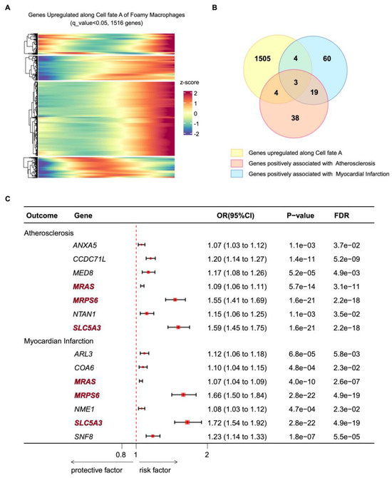 Mendelian randomization analyses revealed a possible causal relationship between cell trajectory genes and atherosclerotic diseases. (A) Heatmap showing the foamy macrophage differentially expressed genes upregulated across pseudotime cell fate A (q value < 0.05). (B) Venn plot showing the overlapping genes among upregulated genes across pseudotime cell fate A (q value < 0.05), atherosclerosis-associated genes (FDR < 0.05), and myocardial infarction-associated genes (FDR < 0.05). (C) Forest plot of the overlapping genes in (B). FDR, false discovery rate. OR, odds ratio.